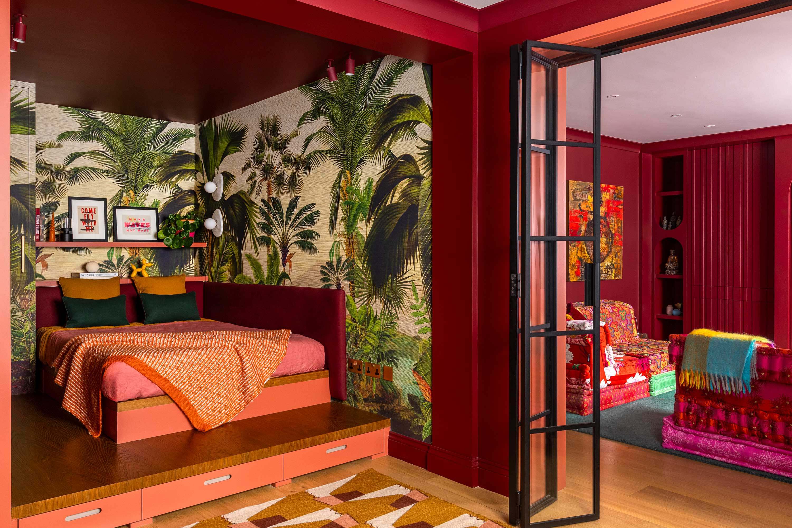 Next door, the film room embraces the dark for a proper “cocoon” effect: deep burgundy wraps the walls and joinery to create a cinematic atmosphere. A slatted feature wall turns the TV into a deliberate composition, while the playful, jewel-toned Mah Jong sofa steals the show and grounds the space.